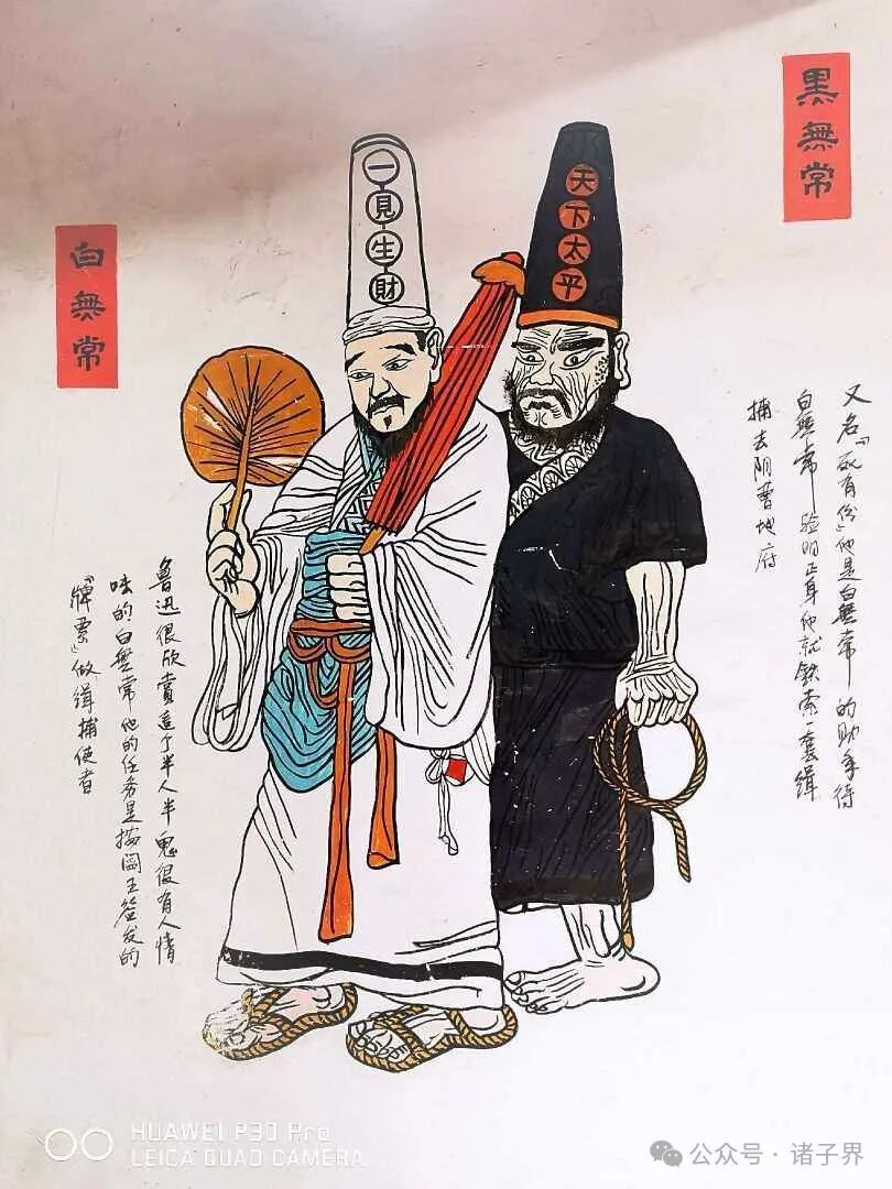 两人到了幽冥地府,阎王念着他们生前重情重义,就让他们继续做地府的捕快。范无救是淹死的,脸色紫黑,不怒而威,唤作黑无常,负责捉拿凶魂恶鬼,高帽上写着“天下太平”,“范无救”意为作奸犯科者,神仙难救;谢必安是上吊死的,脸色惨白,舌头长伸,唤作白无常,负责接引善良之人的灵魂,高帽上写的是“一见生财”,“谢必安”意为感恩神明者,内心安稳。黑白无常成对出现,两人不辞辛劳惩恶扬善,白无常帽子上的“一见生财”意在导人向善,生前积德可以福荫子孙,因此他们在民间百姓的地位可以进入“准财神”的行列(图9)。