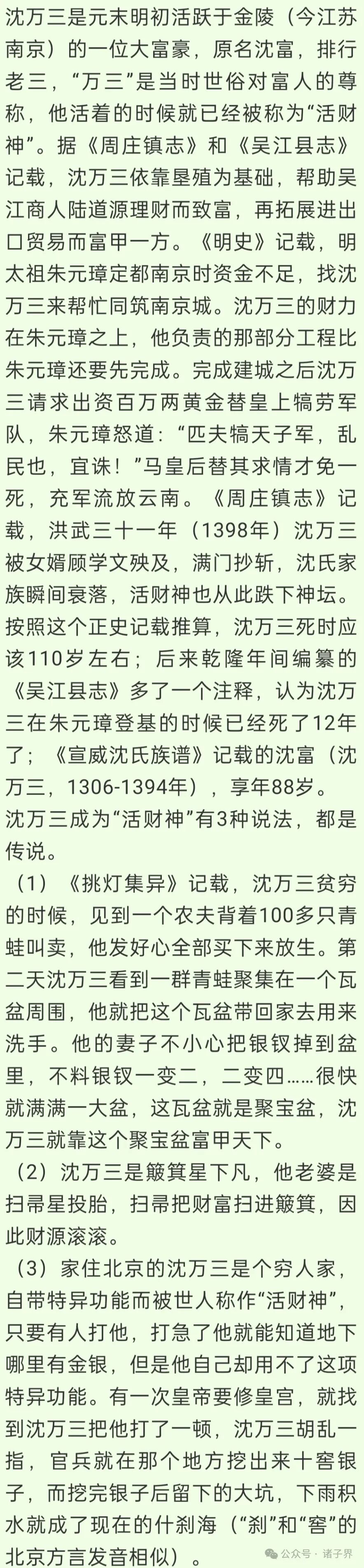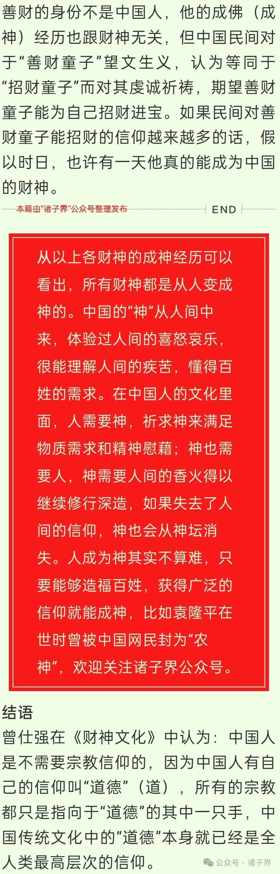 言归正传,财神,除了封神榜上所封的赵公明外,民间信仰、供奉的财神还有很多。本文从凡人的角度考察中国民间各财神的成神经历,以供参考。