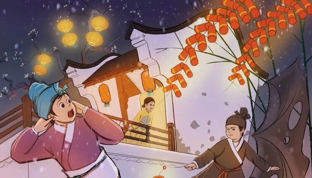 还有几个小孩,在院里点了一堆竹子玩耍,火光通红,竹子"啪啪"的爆响,还将年兽吓跑了。