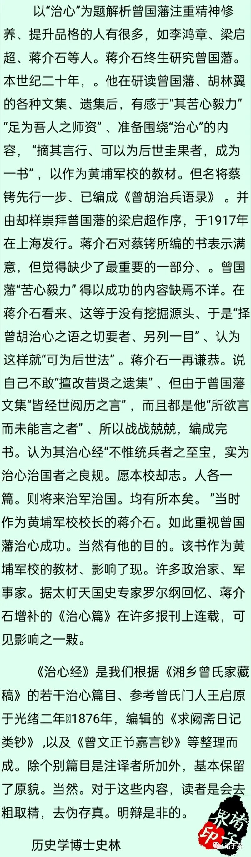 释迦牟尼说:世间一切万物,“壮无过心”。所谓治心,也就是孟子所说的“苦其心志”“曾益其所不能”的功夫,是“天将降大任”前的首门功课。李鸿章说,我老师之有成,乃善治心也。蒋介石称“曾国藩治心之言,皆阅历之语”。毛泽东说,欲动天下者,先动天下之心。心无定旨,人如浮萍,终将无成。曾国藩积数十年之曲折,独创治心之法,先去其毒,陽毒为忿,陰恶为欲。又详述身心兼治、口体并防之十四个妙方。