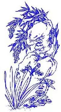 天竹、水仙、灵芝及寿石。天竹、即南天竹,秋季变紫红,果实攒簇殷红,累累若火珠,状颇美观,这里借「天」字。水仙,花发幽香,素称香供佳品,这里借一个「仙」字。寿石,即太湖石,产于太湖区域的多孔而玲珑剔透的石头,供点缀庭院或选作假山之用。用天竹、水仙、灵芝和寿石组成图案喻「天仙祝寿」。