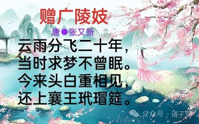 张尝为广陵从事,有酒妓,尝好致情,而终不果纳。至是二十年犹在席,目张悒然,如将涕下。李起更衣,张以指染酒,题词盘上,妓深晓之。李既至,张持杯不乐。李觉之,即命妓歌以送酒。遂唱是词曰:“云雨分飞二十年,当时求梦不曾眠。今来头白重相见,还上襄王玳瑁筵。”
