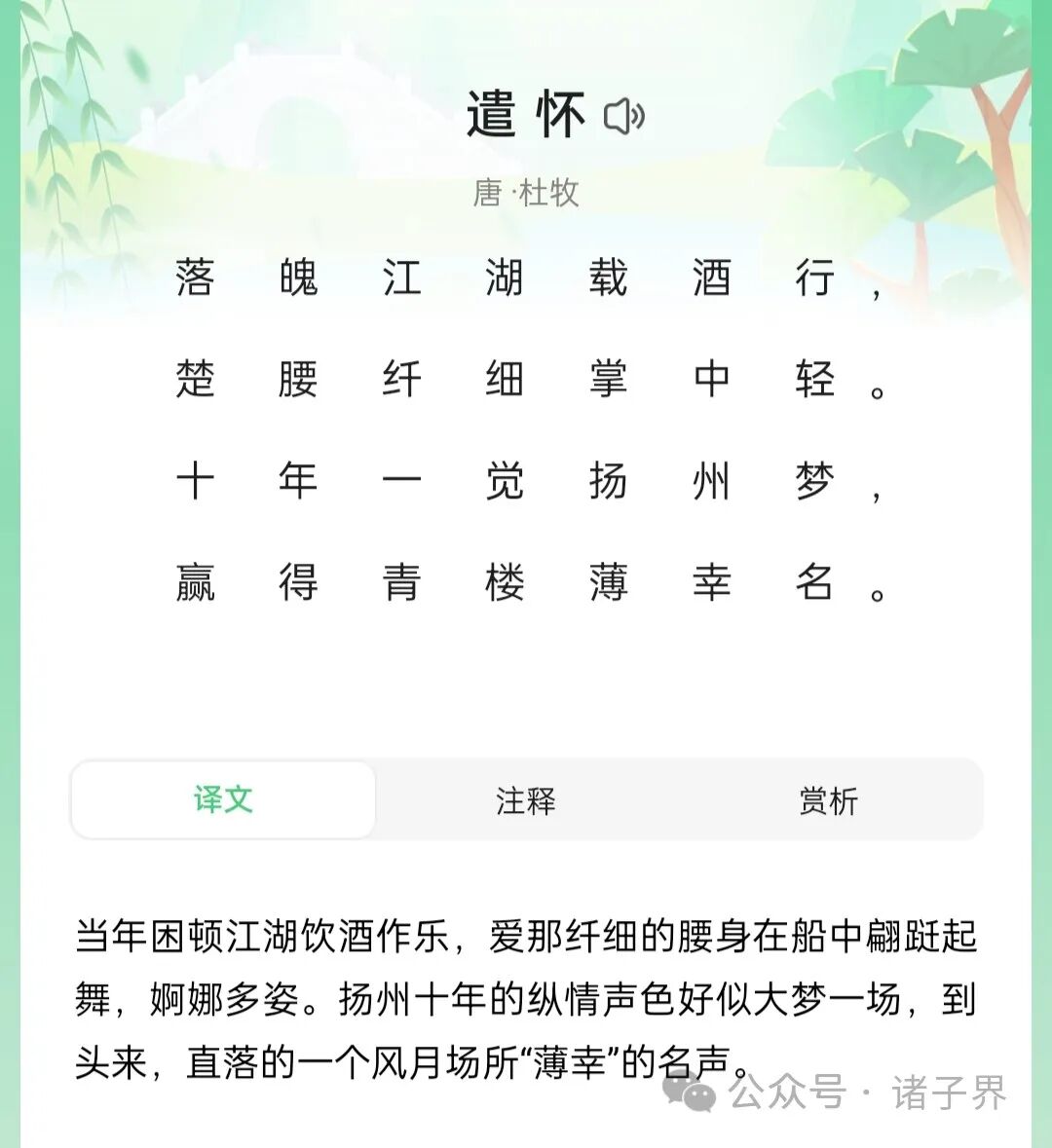 杜登科后,狎游饮酒,为诗曰:“落拓江湖载酒行,楚腰纤细掌中情。三年一觉扬州梦,赢得青楼薄幸名。”