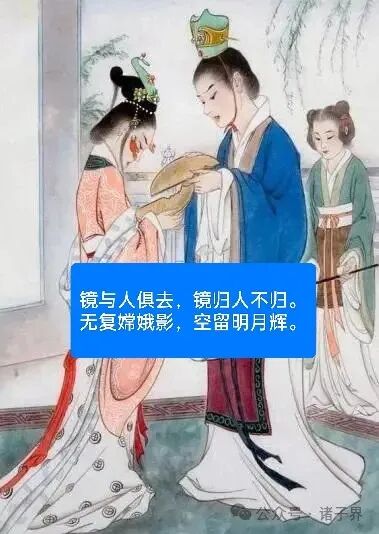 有苍头卖半镜者,大高其价,人皆笑之。德言直引至其居,设食,具言其故,出半镜以合之,仍题诗曰:“镜与人俱去,镜归人不归。无复嫦娥影,空留明月辉。”