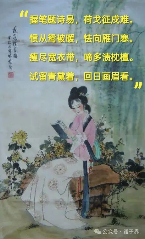 援笔立成,词曰:“握笔题诗易,荷戈征戍难。惯从鸳被暖,怯向雁门寒。瘦尽宽衣带,啼多渍枕檀。试留青黛着,回日画眉看。”