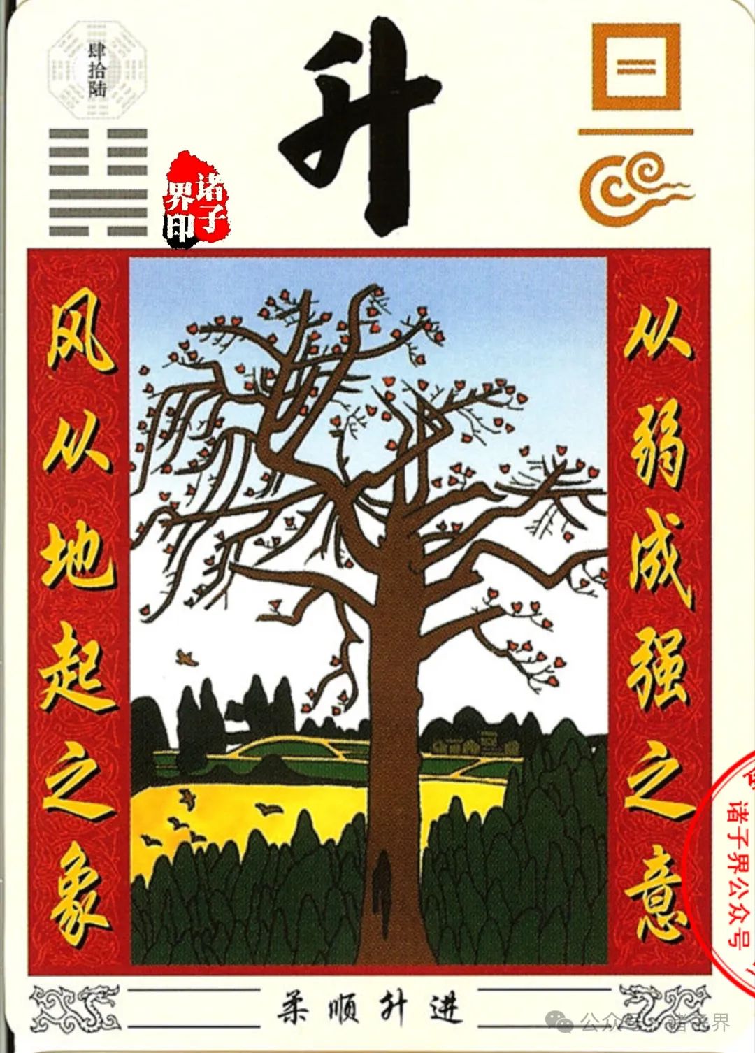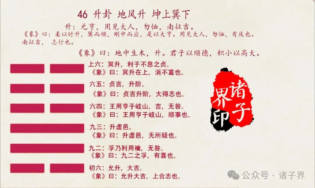 《象辞》说:“阳光从地面上升起,象征着前进和昌盛,也象征着发出自己的光和热。所以,君子应该充分显示自己的才华和美德,发挥自己的作用。