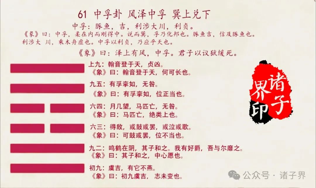 《象辞》说:“具有诚信之德并以其牵系天下人心”,是指居位中正适当,说明中心诚信这种教化作用可以施及整个邦国。