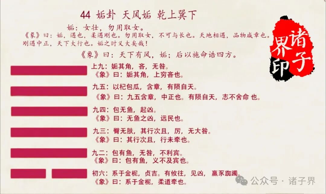 《象辞》说:“不过分恃强恃刚就能遇到阴柔”,因为九四爻以刚居柔位,位置不正;“主动迎合阴柔会有凶险,务必要心存戒惕”,是说若主动迎合阴柔,最终将不可能长久无害。