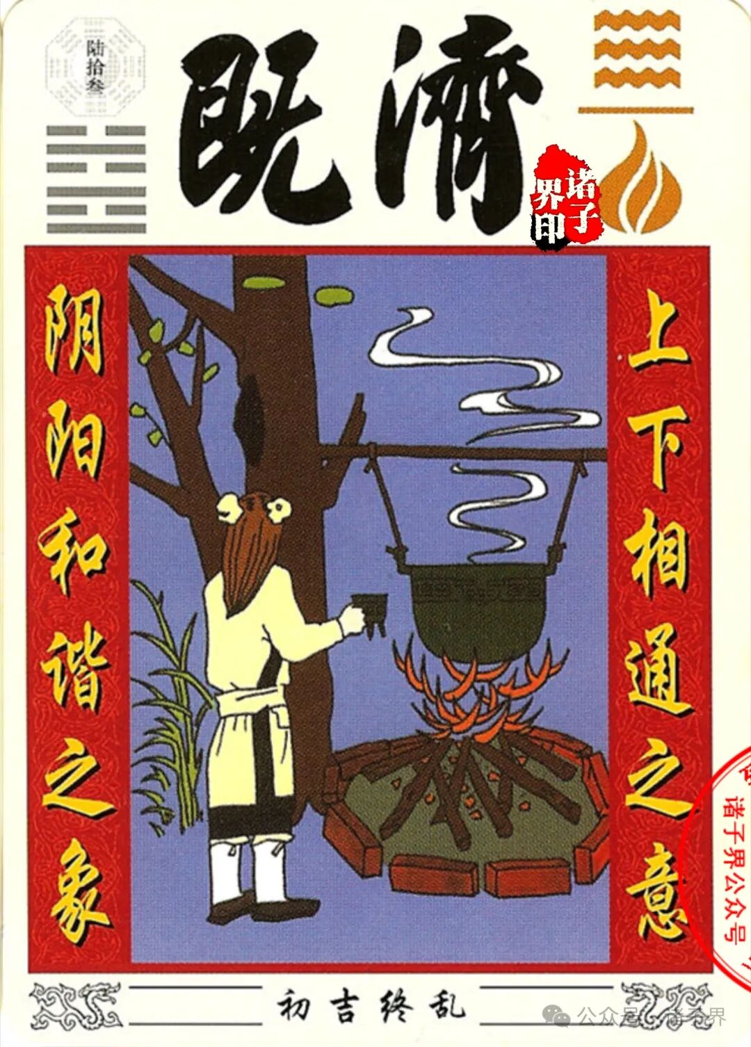 《既济卦》象征成功:此时功德完满,连柔小者都亨通顺利,有利于坚守正道;开始时是吉祥的,但如有不慎,终久必导致混乱。