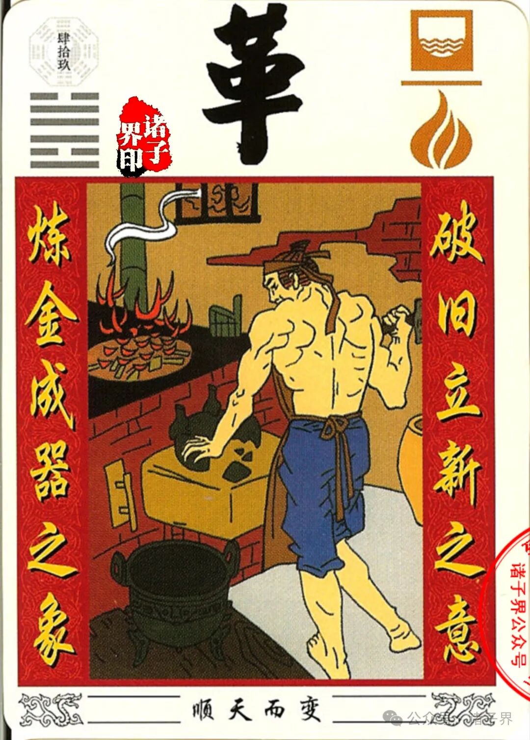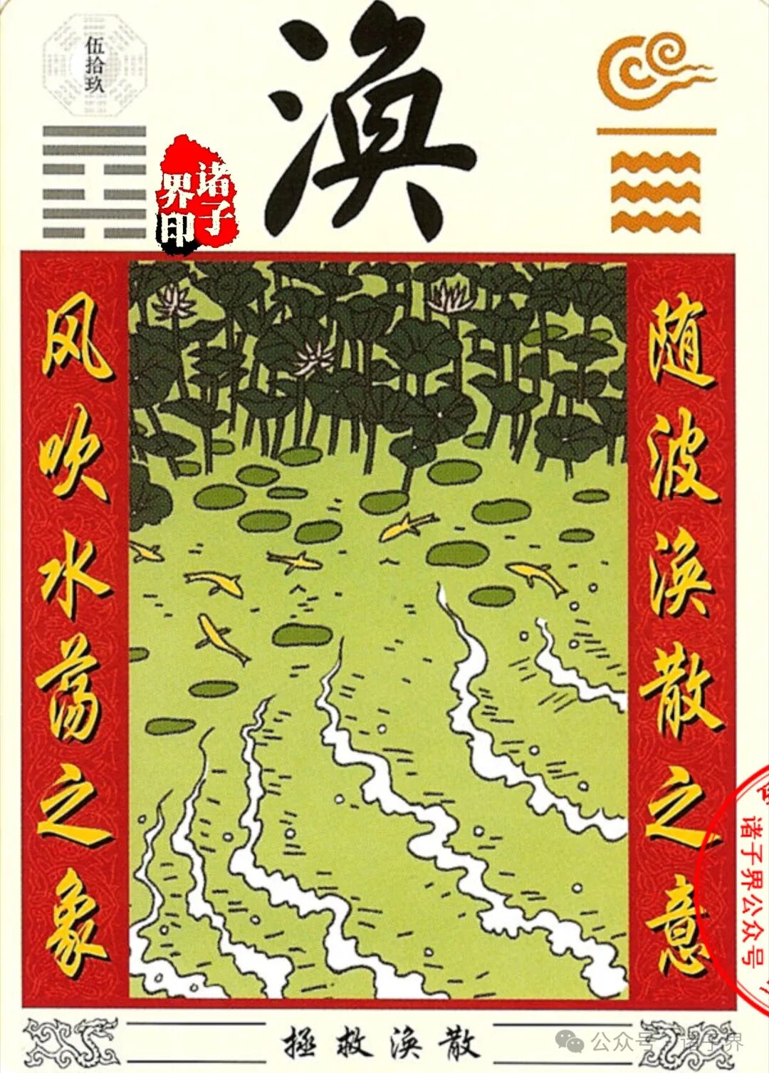 《象辞》说:《未济卦》的卦象是坎(水)下离(火)上,为火在水上之表象。火在水上,大火燃烧,水波浩浩,水火相对相克,象征着未完成;君子此时要明辨各种事物,看到事物的本质,努力使事物的变化趋向好的方面,这样做则万事可成。