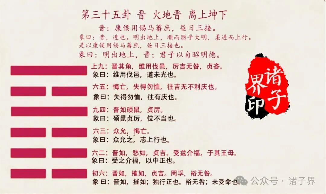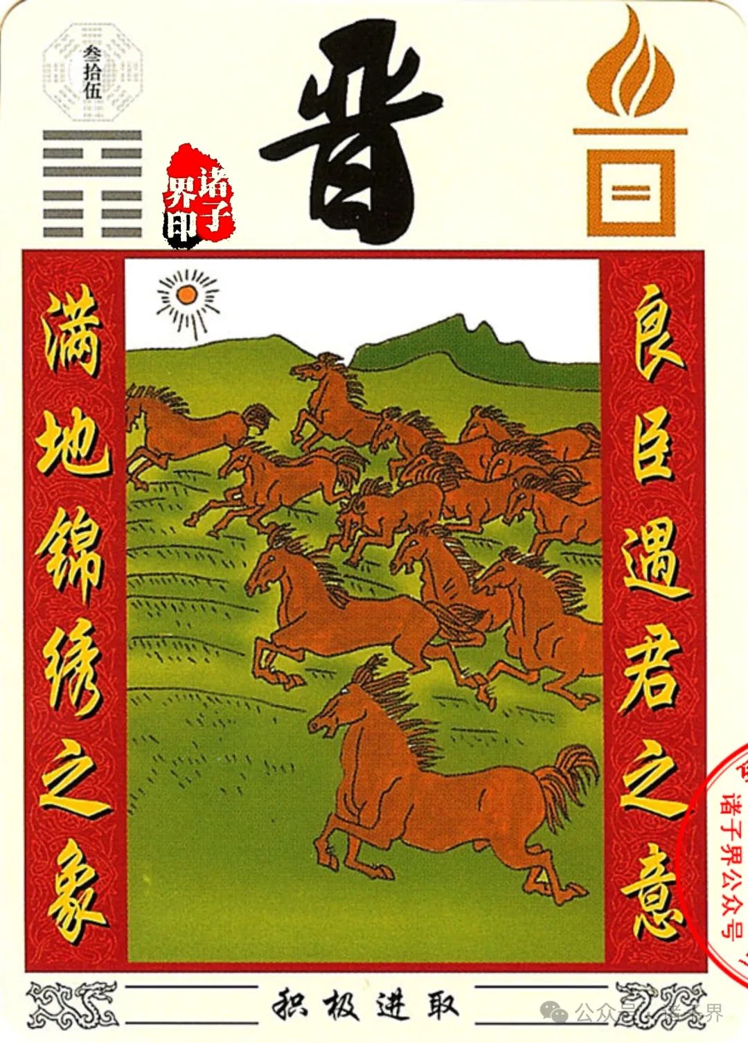 《晋卦》象征长进:就像才干出众的公侯得到了天子的赏识,不仅赐给他许多车马,而且在一天之内多次接见他。