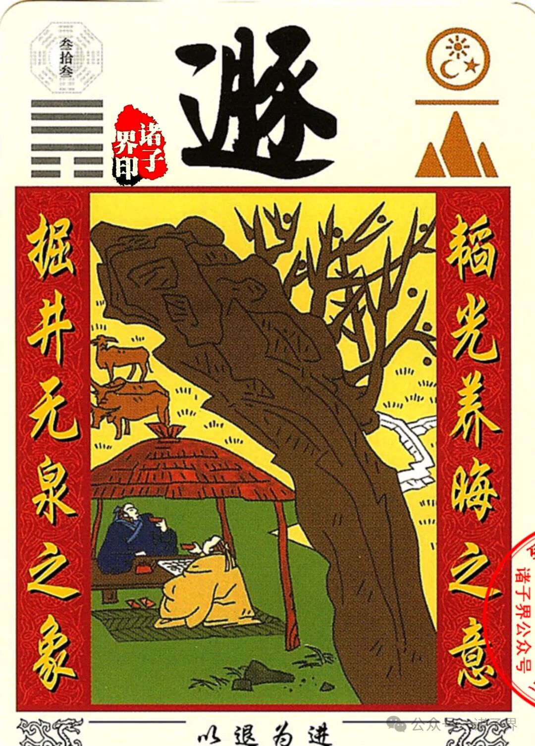 《象辞》说:《遯卦》的卦象是艮(山)下乾(天)上,为天下有山之表象,象征着隐让退避。因为山有多高,天就有多高,似乎山在逼天,而天在步步后退,但天无论怎样后退避让,却始终高踞在山之上。君子应同小人保持一定的距离,以傲然不可侵犯的态度截然划清彼此的界限,这样一来,就自然而然会生出一种震慑住小人的威严来。