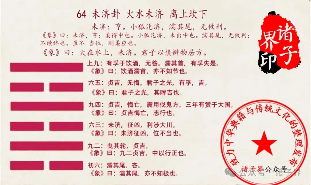 《未济卦》象征事未完成:经过努力可以得到亨通;小狐狸渡河快到对岸了,却浸湿了尾巴,则没有什么吉利。
