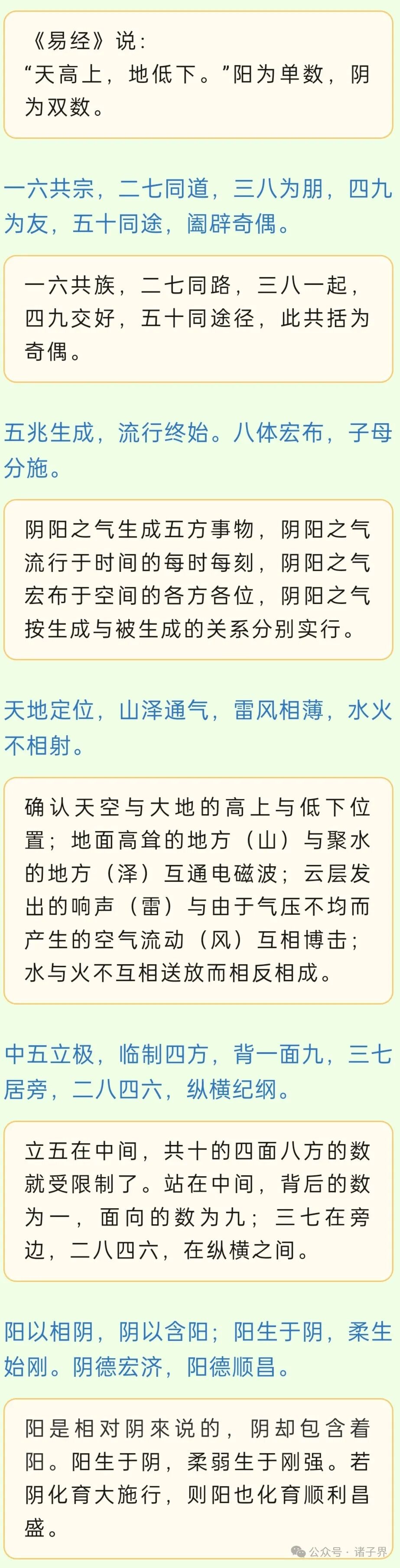 天尊地卑,阳奇阴偶,一六共宗,二七同道,三八为朋,四九为友,五十同途,阖辟奇偶,五兆生成,流行终始,八体宏布,子母分施。天地定位,山泽通气,雷风相薄,水火不相射,中五立极,临制四方,背一面九,三七居旁,二八四六,纵横纪纲,阳以相阴,阴以含阳,阳生于阴,柔生于刚,阴德洪济,阳德顺昌,是故,阳本阴,阴育阳,天依形,地附气,此之谓化始。
