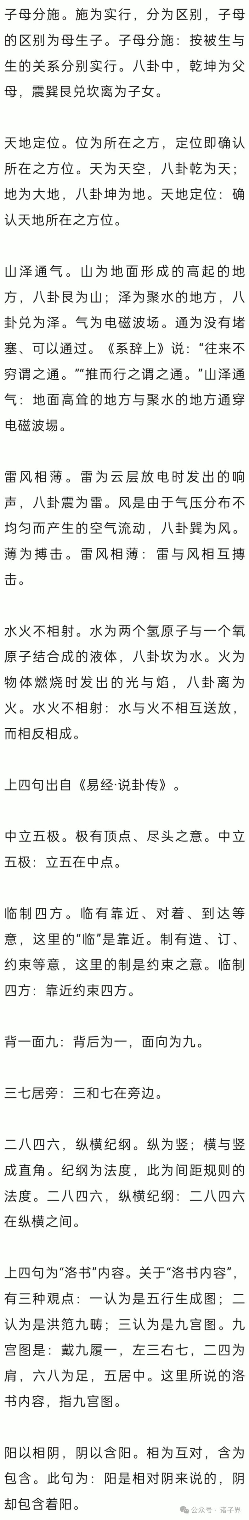 极即是集合,太极即是最大的集合,无极即是非最大集合,最大的集合是从非最大集合中得出来的。(祥细讨论请参考拙文《易经的计算化思想与风水八道》)理为道理,寓为寄居,囿(you读幼)为聚集。腾为升,凝为结。资为助。德有多义,这里的意义是得。乘为接受,界为毗连。兆为事物之理。六甲为甲子、甲寅、甲辰、甲午、甲申、甲戌,这里指更广义的六十甲子。八门为休、生、伤、杜、景、死、惊、开。五运本质上指金木水火土五气的运动变化,具体又称五步运即初运、二运、三运、四运、五运,以五行命名又叫木运、火运、土运、金运、水运,另一种叫法又称为角运、徵运、宫运、商运、羽运。六气指风、君火、相火、湿、燥、寒六种气候的运动变化。五运六气都是推测气候变化的。地德:德有多义,这里指规律。地德即地气规律。人道:人类社会的道理法制。因为遵顺。原有多义,这里指研究。化成:演化生育完成。