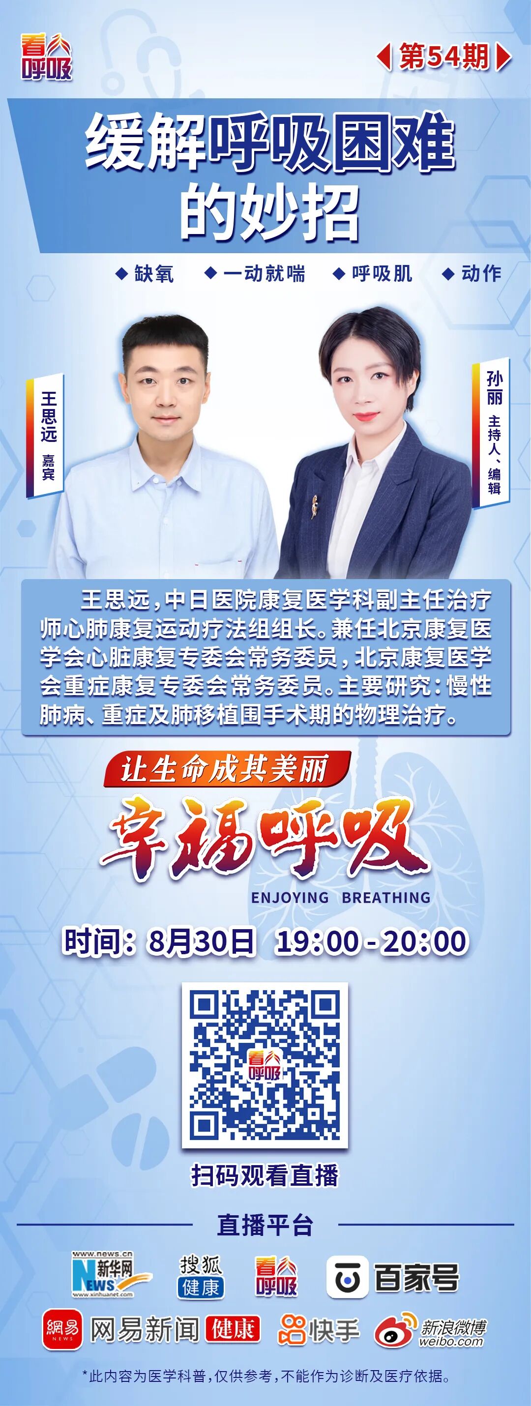 本周三(8月30日)晚7:00,我们邀请了中日医院康复医学科副主任治疗师王思远做客《幸福呼吸》--让生命成其美丽科普直播间,一起来聊聊“缓解呼吸困难的妙招?”。