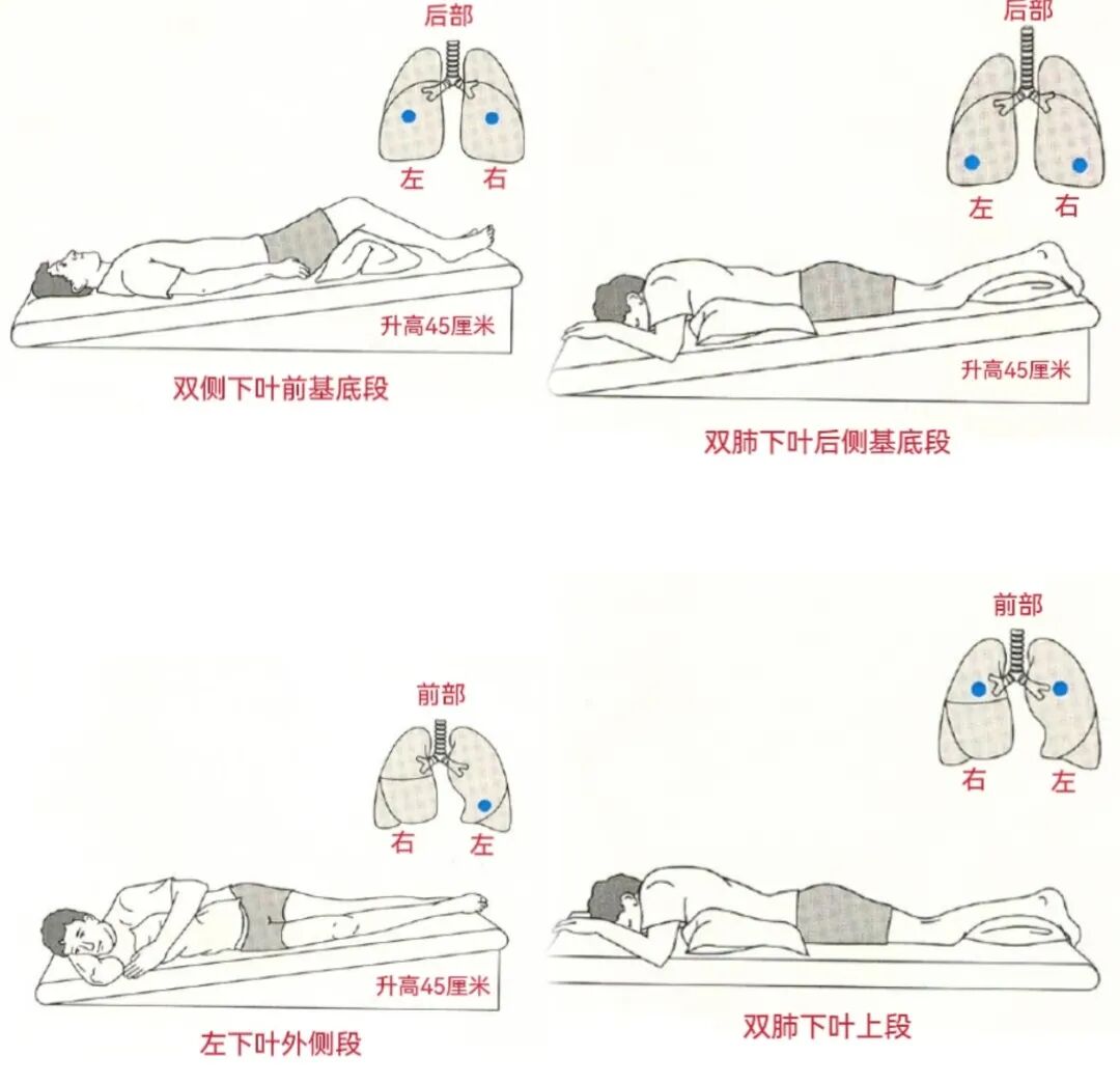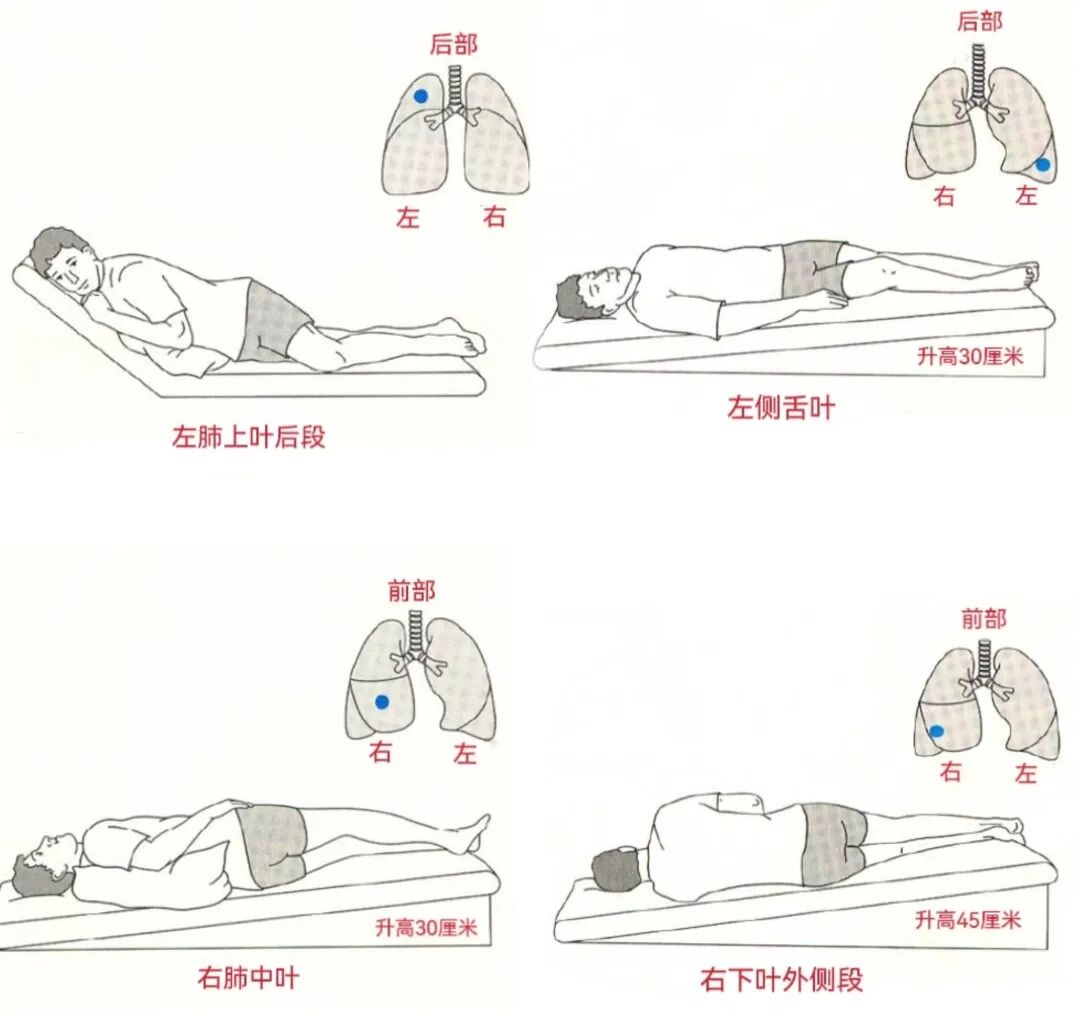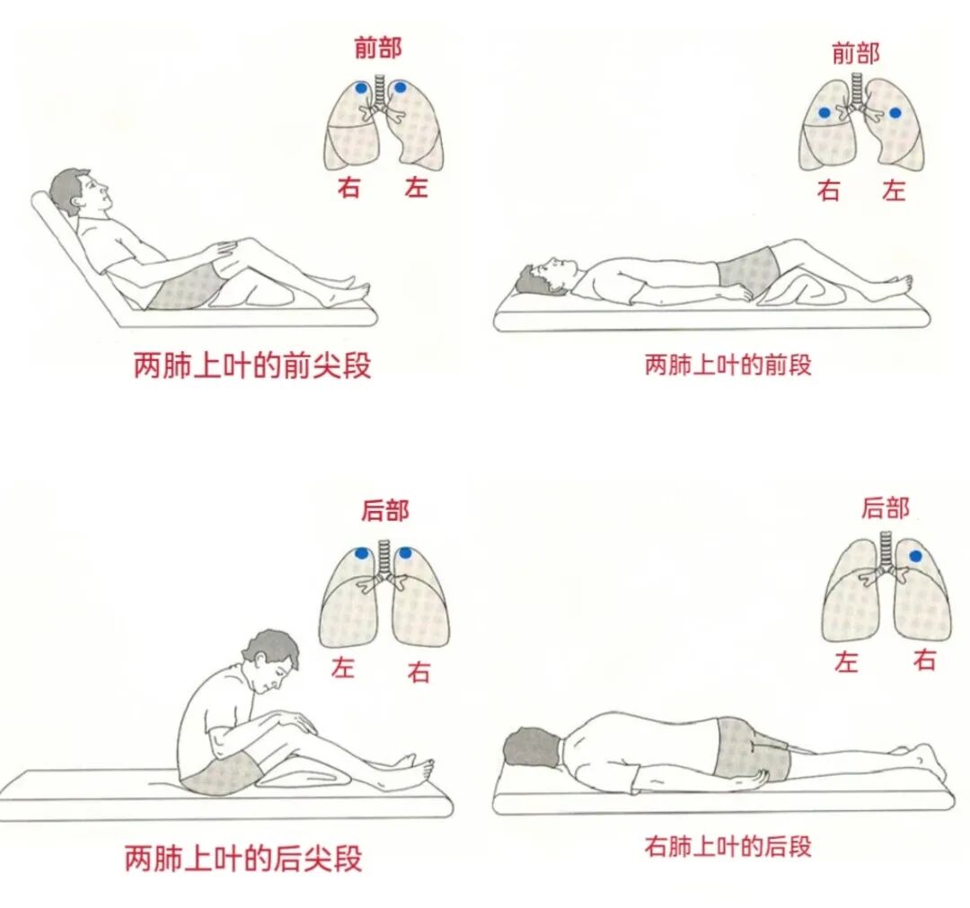 “至于采取哪种体位,这取决于痰液所在的部位,大家需要先到医院查体找到感染的位置,再借助枕头、被子或者可以调节角度的床,对照下图选择合适的体位。”