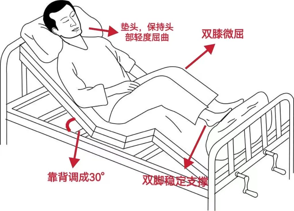 坐在椅子上或者床边,双脚着地,双肩放松,如果不能坐起来,就保持半卧位。