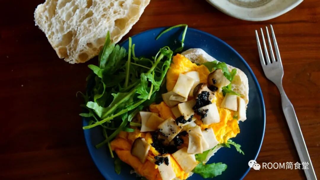 黑松露炒蛋除了配米饭,还可以用来配面包。我把它堆上了自己做的恰巴塔,如此美味的早餐吃下去,感觉早晨的活力也瞬间满满了。其实好吃可以很简单,健康也可以很简单。