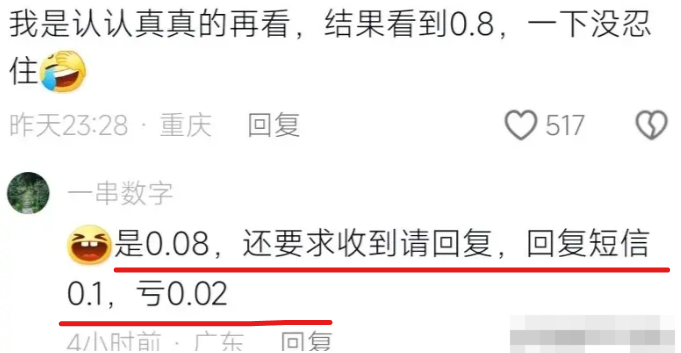 ➤ 退费真的是0.08,还要求收到请回复,回复短息1毛钱,亏0.02