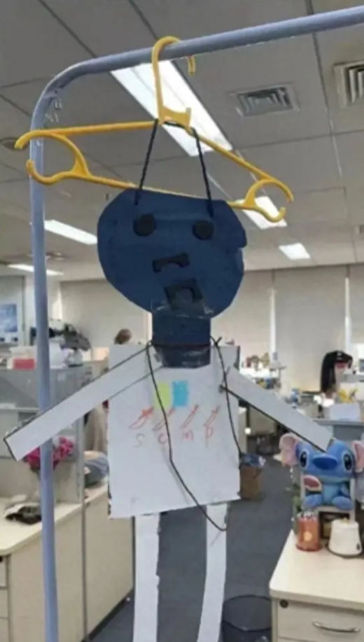 在办公室愤怒抽打纸扎小人,