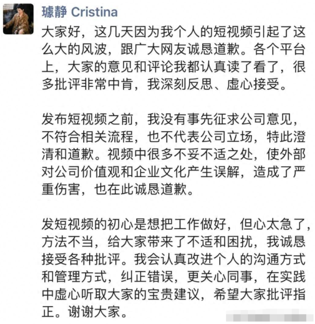 璩静在其朋友圈发文致歉,