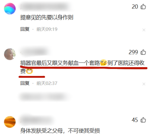 & 网友认为捐献器官和义务献血一个套路,到了医院还需要收费,认为身体发肤受之父母,不可损伤