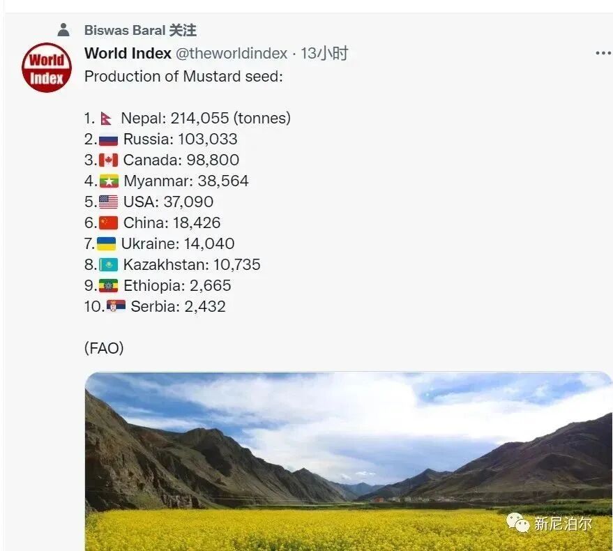 这个截图表明,尼泊尔的芥菜籽产量居全世界第一位。老天爷赐予了尼泊尔得天独厚的资源,关键是如何去利用好。