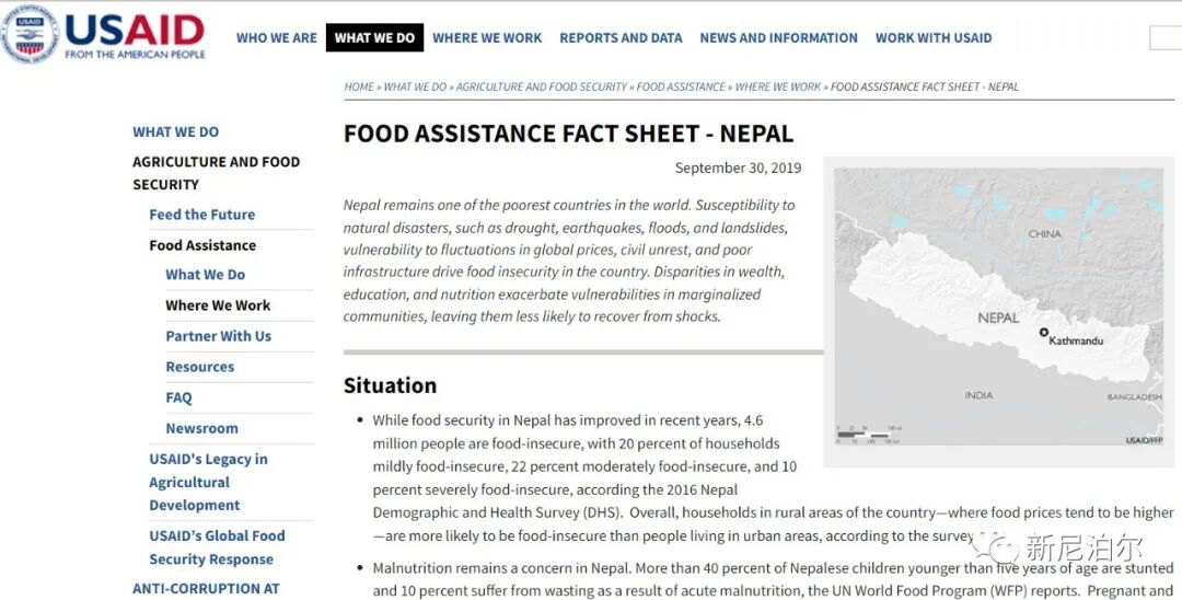 根据联合国开发署2019年的统计,尼泊尔全国近3000万人口,有460万人口的食物不足,20%的家庭面临中度的食物缺乏。
