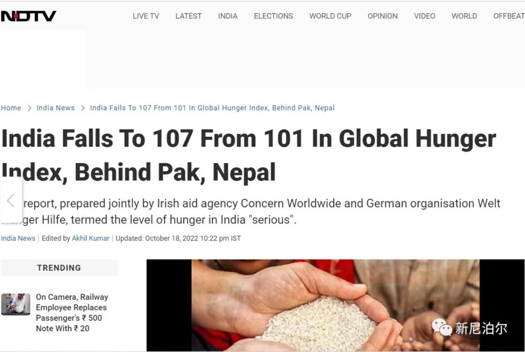 德国“救济世界饥饿组织”(Welt Hunger Hilfe)和爱尔兰“关注世界”(Concern Worldwide)两个非政府组织联合发布了2022年全球饥饿指数,印度的排名,从2021年的101位,后退到了107位,饥饿情况属于“严重”级别。