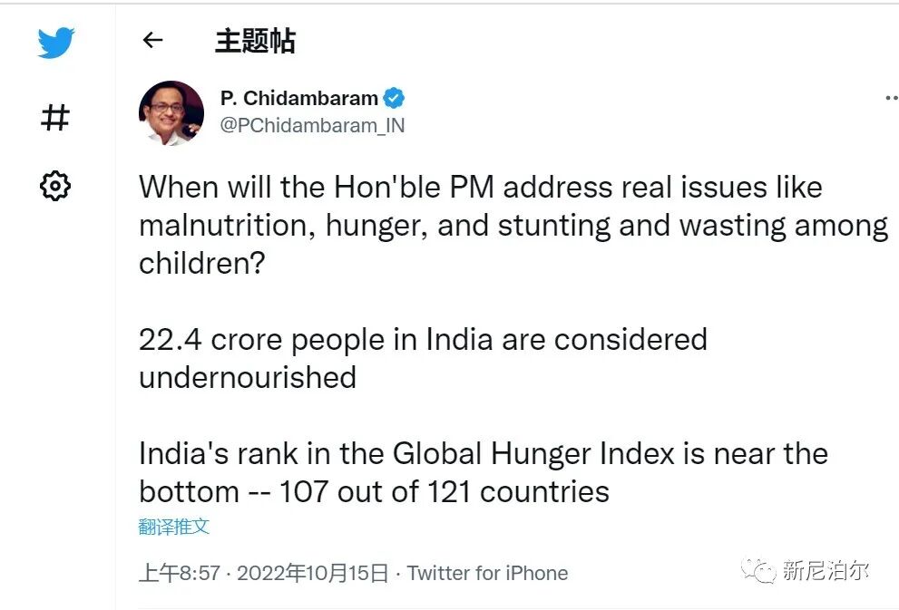 印度议员抱怨说,莫迪总理老是吹嘘自己的经济成就,可印度有2.24亿人营养不良。