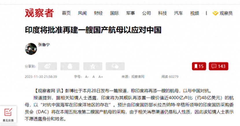 根据知情人士透露,印度打造第二艘国产航母,除了用于对付中国之外,更是要用于应对各国不断加强在印度洋上部署军舰的情况。