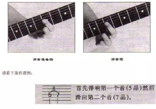滑音是吉他上的一种弹奏技巧。滑音是左手指在同一根弦上由一个品位滑到另一个品位而使琴发出声音,不需要右手的参与。分为上行滑音和下行滑音。在吉他六线谱中用S表示。弹奏方法:滑音第一个音的左手指按好,右手拨出,然后不离开指板滑向下个音位,下行同样由第一个音滑向第二个音,也不离开指板。在弹奏时注意左手指要垂直按弦,滑行时手指不能松动,力度均匀适中,滑动平稳,同时还要注意左手拇指的放松。