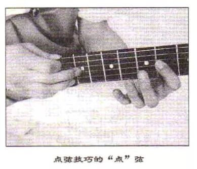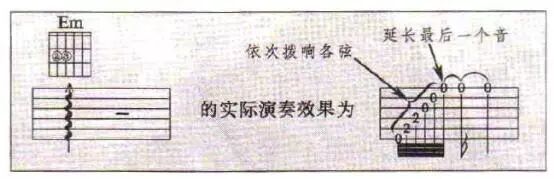 “琶音奏法”是指匀速一次拨响和弦的各个音,并且延长最后一个音。有四根弦琶音,有五根弦琶音,也有六根弦琶音。有从六弦方向拨响一弦的下琶音,也有从一弦拨向六弦方向的琶音,以六根弦的下琶音最为常用。