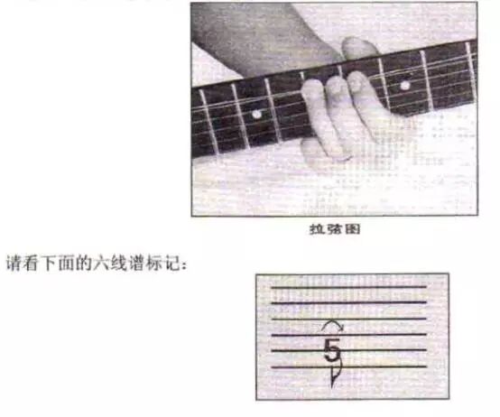 拉弦,其实就是吉他的低音弦的推弦,一般电吉他的1、2、3弦比较细,所以向上推比较容易,也比较科学,而4、5、6弦要是再向上推就不太方便了,如果4弦上推,那还不算错,可以进行上推,可5、6弦要进行上推肯定会有麻烦,所以当需要改变5、6弦音程时,我们将采用“下拉弦”来改变其音程,请看拉弦图: