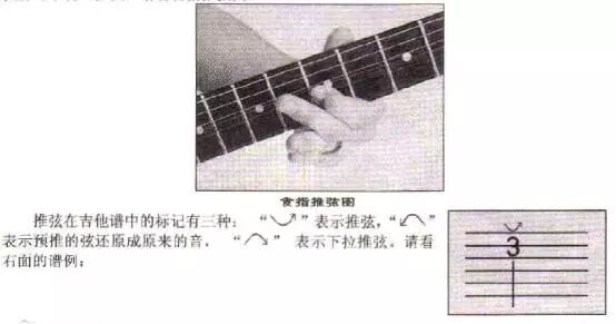 左手拇指与食指轻轻夹住琴颈,按弦时转动手腕,琴弦因为弯曲后产生张力而音程增大。用在Pick吉他演奏中。分为半音推弦、1/4推弦;全音推弦;小三度推弦或小三度以上推弦。