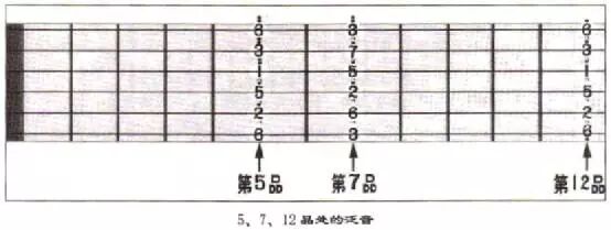 自然泛音是指在弦的原长上所发出的音。在弦长1/2(吉他第12品)处、1/3(吉他第七品)处、1/4(吉他第五品)处都可以轻松的演奏出泛音,其中尤其以弦长的1/2(吉他的12品)处的泛音最为明亮,最容易演奏出来。能弹出泛音的地方称为“泛音点”,它与我们弹奏音阶不同,音阶按弦在品柱与品柱之间,而泛音点再品柱的正上方。见下面5、7、12品处的泛音图