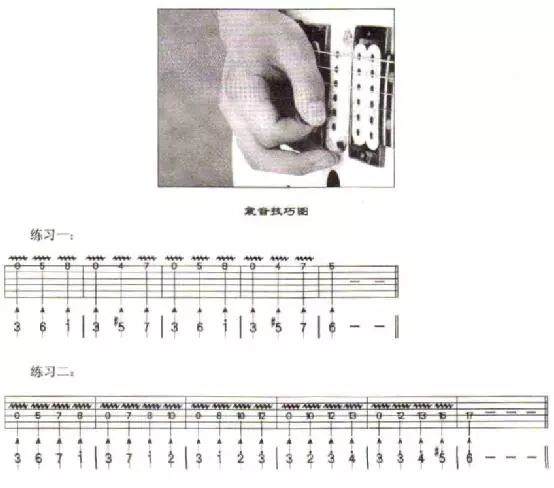 电吉他的人工泛音不受品位限制,他可以在任意品上进行,我们做出的人工泛音和我们的琴、音箱、效果器有很大的直接性关系,它们直接影响到我们的泛音音色,当然,练习它也是必不可少的,我们需要做大量的练习才可以完全掌握。请看上面的人工泛音图:现在我们来练习一下人工泛音,电吉他的人工泛音通常与颤音一同使用。