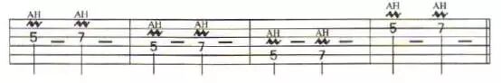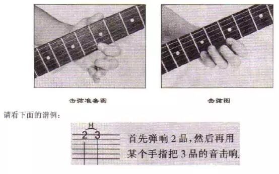 击弦用英文字母“H”表示,也叫打音。击弦在重金属音乐中极为常用,击弦的步骤为:首先,弹响第一个音,然后,用某一个手指把第二个音击响,这个过程就是击弦,但要记住,第二个音是挤出来的,不是弹出来的,只有第一个音是弹出来的。请看下面的击弦图片: