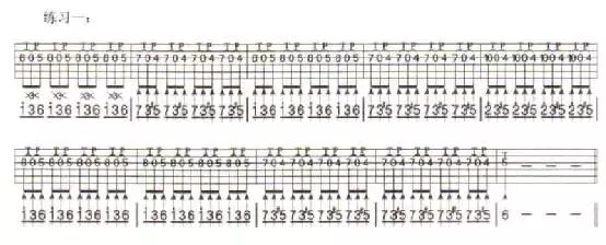 切音技巧在电吉他的演奏中起着“加花”的作用,很多时候我们可以用切音来突出某个音域或和弦。甚至,我们还可以用切音来演奏一些不必要的和声进行,以突出主和声。切音可能听起来稍微有些闷音,但这两种技巧是完全不同的,闷音只能用右手来做。切音既可以用左手来完成,也可以用右手来完成,甚至双手齐下也可以。总之,这两种技巧是完全不一样的,要掌握好。下面就让我们进行切音练习,切音符号用“.”来表示,它标记在扫弦箭头的正上方。