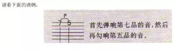 勾弦用英文字母“P”表示,勾弦的力度要适中。方法为:首先弹响高把位的音(下面的音),然后用某个手指把低把位的音(上面的音)勾响,这个过程就是勾弦。