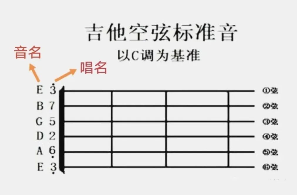 这是学习吉他指板的基础。吉他的六根弦,从粗到细,标准定音分别是E、A、D、G、B、E。记住这些空弦音是进一步学习的基础。
