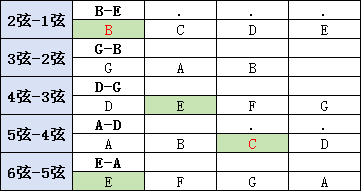 绿色代表半音,可以清楚看到3弦到2弦之间间距为四品,其他两个和弦间距为5品。