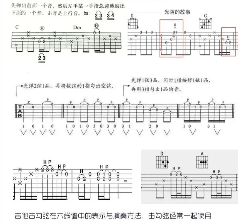 击弦通常表示为“H”或者用弧线连接两个音符,并在上方标记一个小圆点或者“^”符号。这表示先用一个手指按住第一个音符,然后用另一个手指敲击第二个音符,而不需要用拨弦的方式。