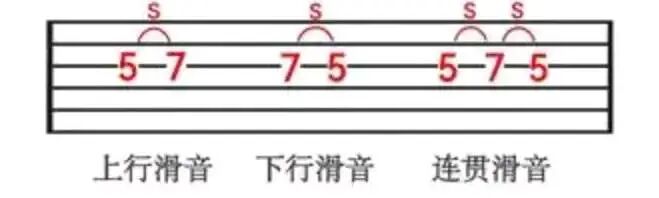 滑弦通常用小写的“s”表示,如果滑弦的方向是向上的,则会在“s”上方加一个箭头;如果方向是向下的,则在“s”下方加箭头。连续的滑弦可以用曲线连接起相关的音符来表示。