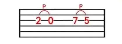勾弦则用“P”表示,它表示先用一个手指按住一个音符并拨弦,然后用同一个手指勾动琴弦,使得下一个音符发声。有时候,勾弦也会用“^”表示,特别是当第二个音符比第一个音符低时。
