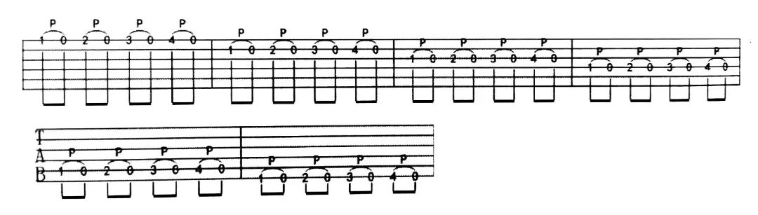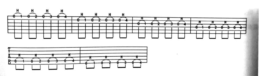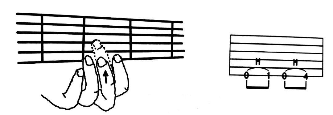 击弦的弹奏:大关节发力,左手指尖准确敲击在琴弦对应的品格上,切忌手指大幅度。(上图为左手击弦1-4指轮流练习) 二、勾弦技巧 勾弦是另一种常见的吉他技巧,它可以让你的演奏更具动态和节奏感。以下是一些勾弦技巧的要点: