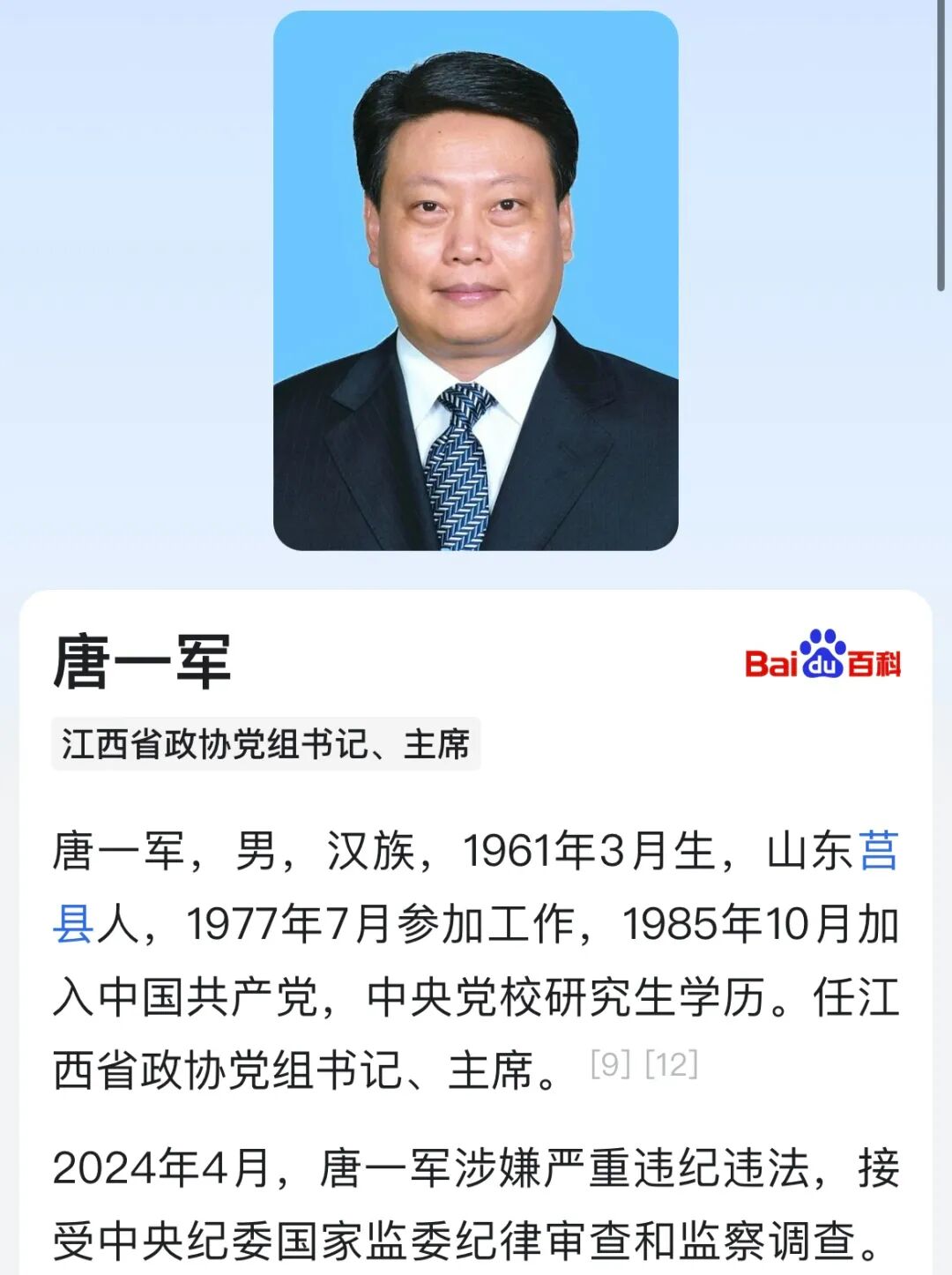 唐一军,2024年4月,因涉嫌严重违纪违法,接受中央纪委国家监委纪律审查和监察调查,