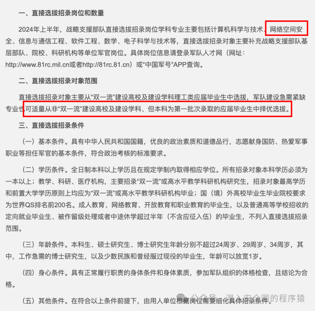 这两天频频提到的“网络空间部队”,很多师傅都说要去当兵,很好奇他的招聘要求,于是我去网上搜索了一下对应的信息,下面是之前未拆分之前的战略支援部队的2024年的社会招聘信息。