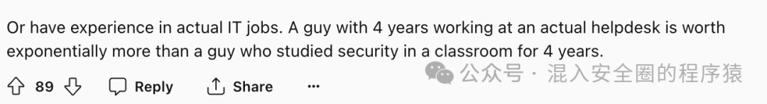 有实际IT工作经验。一个有着4年Help Desk实际工作经验的人会比在教室学习了4年安全知识的人要更有用。